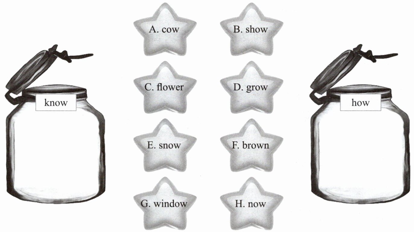 Nana 在玩摘星星游戏。朗读单词,根据字母组合 “ow” 的发音给星星分类,将字母序号写在对应的瓶子里。