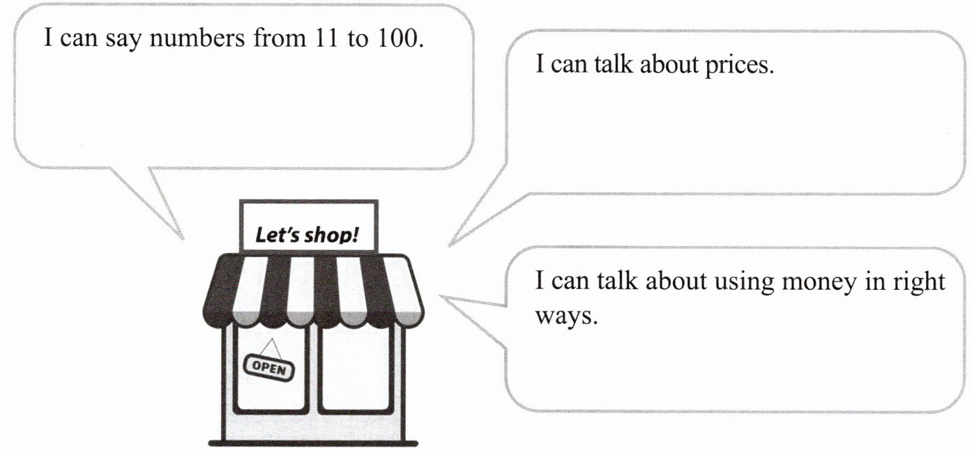 【解析】:本题是英语科目四年级上册Unit 4 Let's shop!章节的反思题,主要考查学生对本单元知识点的总结和感想。从题目给出的插图及对话气泡内容可知,本单元涉及了说数字(从11到100)、谈论价格、谈论正确使用金钱等知识点。学生需要回顾这些知识点,并结合自己的学习情况进行总结和感想分享。