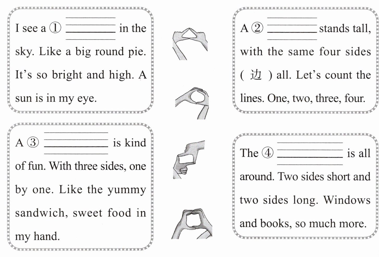 每个人对形状都有不同的认知和呈现方式。选择合适的单词写在四线格里,补全歌谣,并将歌谣与对应的图片连线。