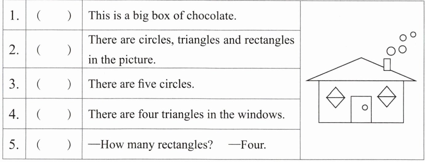 Toby用简单的形状画了一幅画。读一读,判断下列句子与图片内容是否相符,相符的在括号里写“T”,不相符的写“F”。