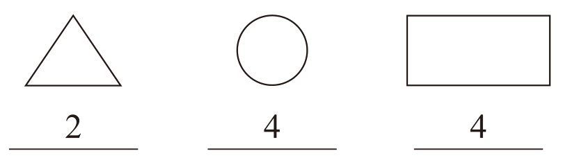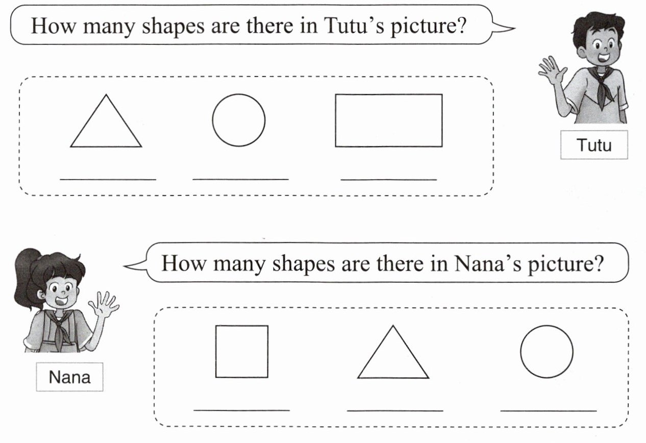 Tutu和Nana画了简单的几何图画。听录音,根据听到的内容,判断他们的图画中不同形状的数量,写在对应的横线上。