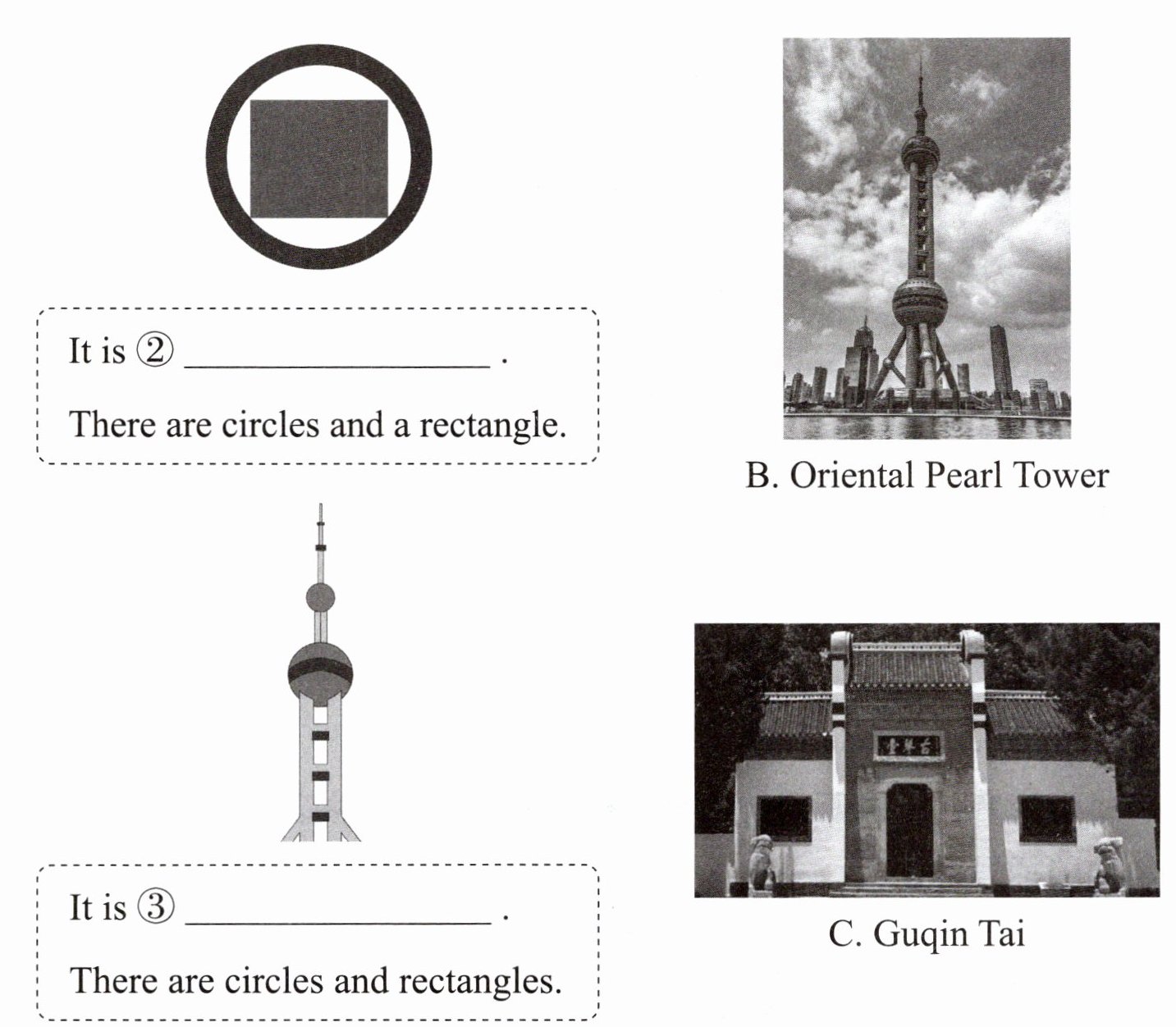 1. Toby和同学们对着照片画了许多中国的建筑。仔细观察,找到与画作相对应的建筑,将其字母序号写在对应的横线上。