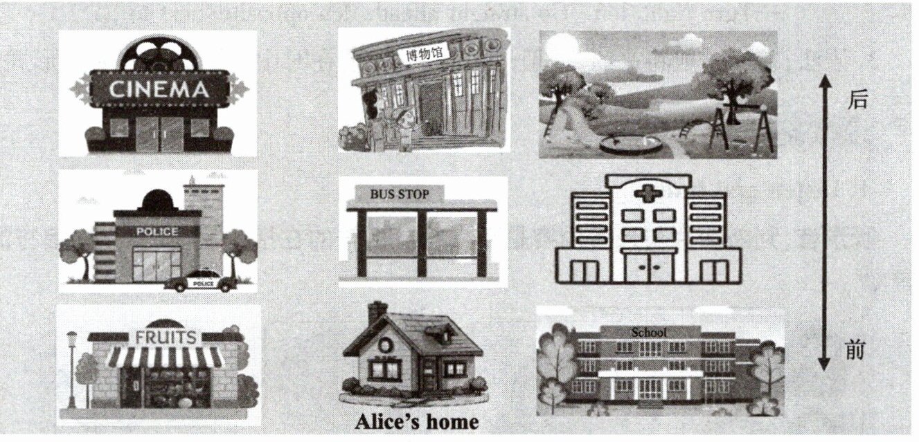 ①opposite/in front of ②museum ③next to/beside ④in front of/opposite ⑤hospital ⑥beside/next to ⑦cinema ⑧behind