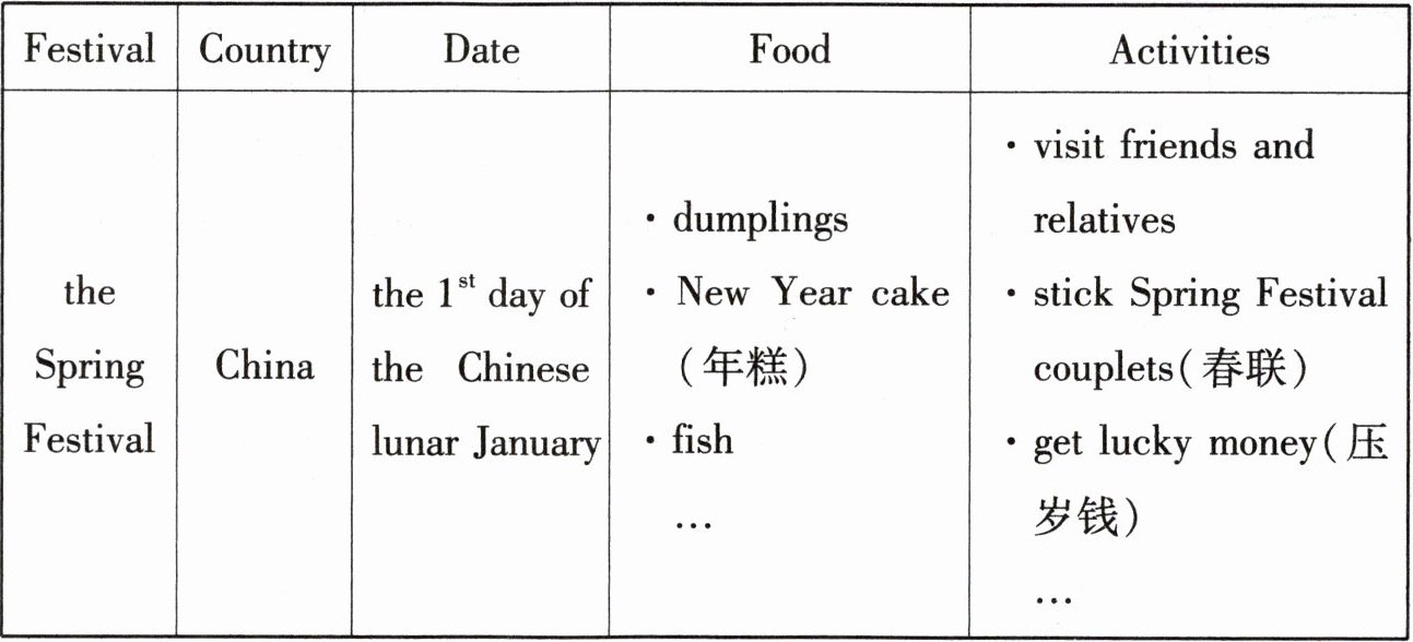 【解析】:本题考查的是对表格信息的提取与整合能力,以及用英语进行书面表达的能力。需要从表格中获取春节的相关信息,包括节日名称、所在国家、日期、食物和活动,然后用英语将这些信息组织成一篇小短文。