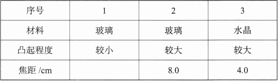 (2)第1次测得的凸透镜焦距为10.0 cm,根据表中1、2次的实验数据可知,材料相同的凸透镜,凸起程度越大其焦距越小。