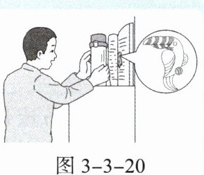 4.如图3−3−20所示,小刚将盛满水的圆柱形透明玻璃杯贴近书本,透过玻璃杯观看书上的鹦鹉图片(圆圈中的鹦鹉图与书本