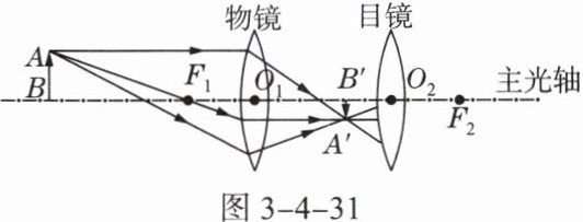 9. 如图3-4-31所示为一种望远镜内部部分光路图,物镜和目镜都是凸透镜,O₁为物镜光心,F₁为物镜焦点,O₂为目镜的光心,F₂为目镜焦点。