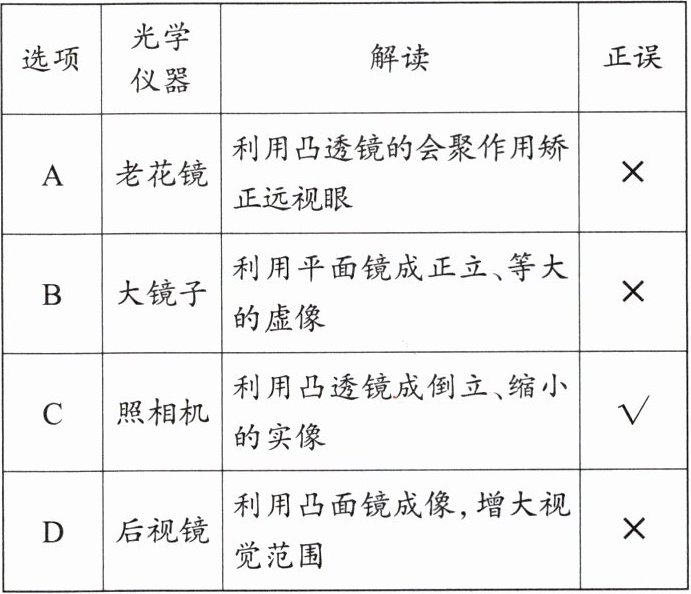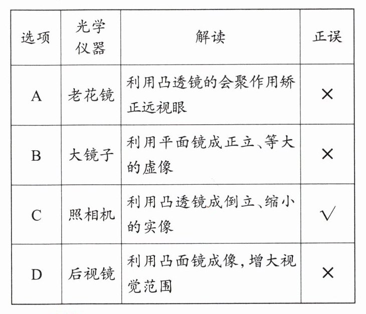 解析:近视眼的成像原理是光的折射,小孔成像的原理是光的直线传播,原理不同,A错误;近视眼是因为晶状体太厚,折光能力太强,使远处物体的像落在视网膜前,看不清远处的物体,需要戴凹透镜进行矫正,B、C正确;人眼的成像原理和照相机相同,所成的像是倒立、缩小的实像,D正确。