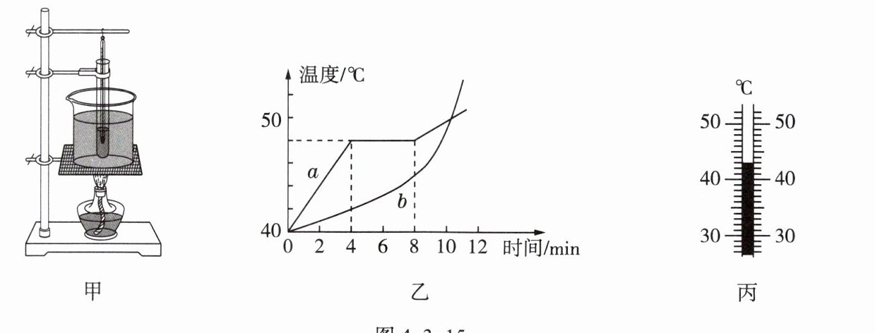 (2024·山东泰安中考节选·3分)小文同学用如图4-3-15甲所示装置“探究固体熔化时温度的变化规律”,用温度计分别测量a、b两种物质的温度,温度随时间变化的关系图像如图乙所示。