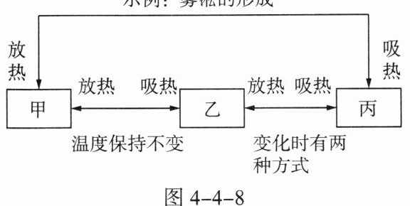 4. 如图4-4-8的知识网络结构,为某物质通过放热、吸热呈现甲、乙、丙三种物态间的变化,根据知识网络结构所提供的信息。以下论述正确的是(