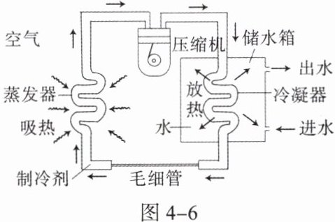 空气能热水器是吸收空气的内能来制造热水的装置。如图4-6所示是空气能热水器的工作原理示意图,它主要由储水箱、毛细管、蒸发器、压缩机、冷凝器等部件组成。制冷剂是一种在常温下极易汽化的液体,它在毛细管、蒸发器、压缩机、冷凝器之间的循环过程与我们所熟悉的电冰箱的制冷循环过程相同,其工作过程如下: