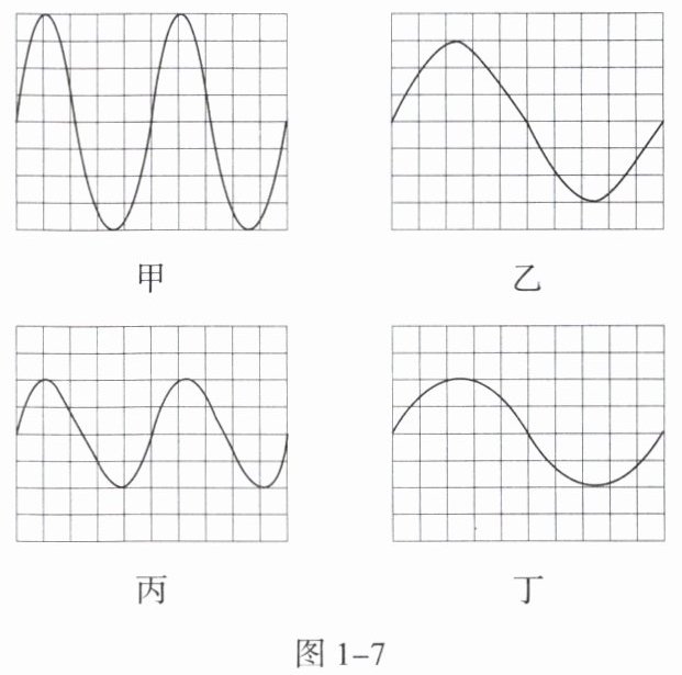 6. 将四个音叉发出的声音信号输入设置一样的同一示波器,波形如图1-7所示,甲音叉发出声音的频率是512 Hz,则以下说法错误的是(