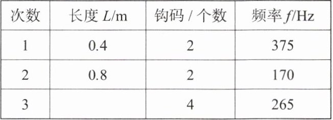 次实验中琴弦发声的音调最高。|次数|长度L/m|钩码/个数|频率f/Hz|