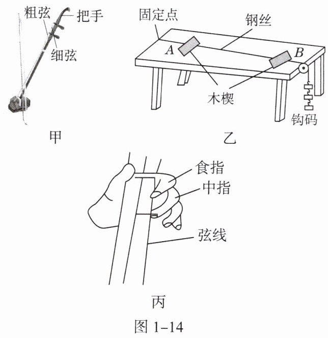 14. (2024·江苏南通崇川区校级月考)弦乐器一般都是由两端固定的琴弦产生振动而发声的,如图1-14甲所示。为了研究同一根钢制琴弦发声音调与哪些因素有关,可利用图乙所示实验装置。一块厚木板上有A、B两个木楔支撑着琴弦,其中A楔固定,B楔可沿木板移动以改变琴弦振动部分的长度。将钢制琴弦的末端固定在木板一端,另一端通过滑轮悬挂不同个数的相同钩码,钩码个数越多,琴弦绷得越紧。轻轻拨动琴弦,在AB间产生振动,并用仪器测出发声频率。