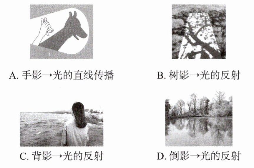 | D | 倒影 | 倒影是平面镜成像,是光的反射形成的 | √ |