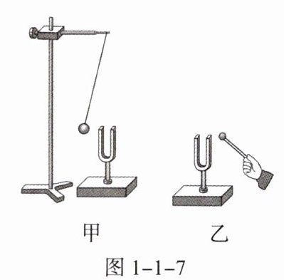 例4 俗话说“一石激起千层浪”是指石块击打水面时,水面上会形成跌宕起伏向四周传播的波浪,此时水面上的树叶也随之荡漾,我们说,石头的能量是通过______传给了树叶;如图1-1-7所示,敲响乙音叉,叉股振动使周围空气振动形成______的波动形态向四周扩散传开,这种波动形态称为______,和水波一样,在传播过程中,介质随之振动,在传播振动的同时也能将______传递出去,使甲音叉也______发声,将乒乓球弹开。通过水波来研究声波的方法称为______。