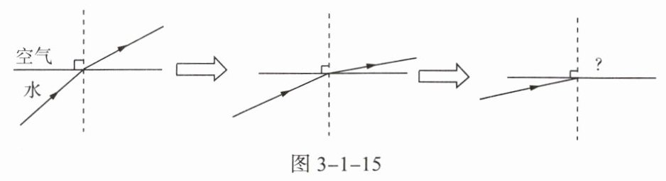 根据光经过的路径,首先想到了这种现象与光的折射有关,为此他根据光从水射向空气中的光路进行了推测,如图3-1-15所示,光从水斜射向空气中时,折射角大于入射角,当入射角逐渐增大时,折射角也逐渐增大,那么,当入射角增大到某一值时,会不会……