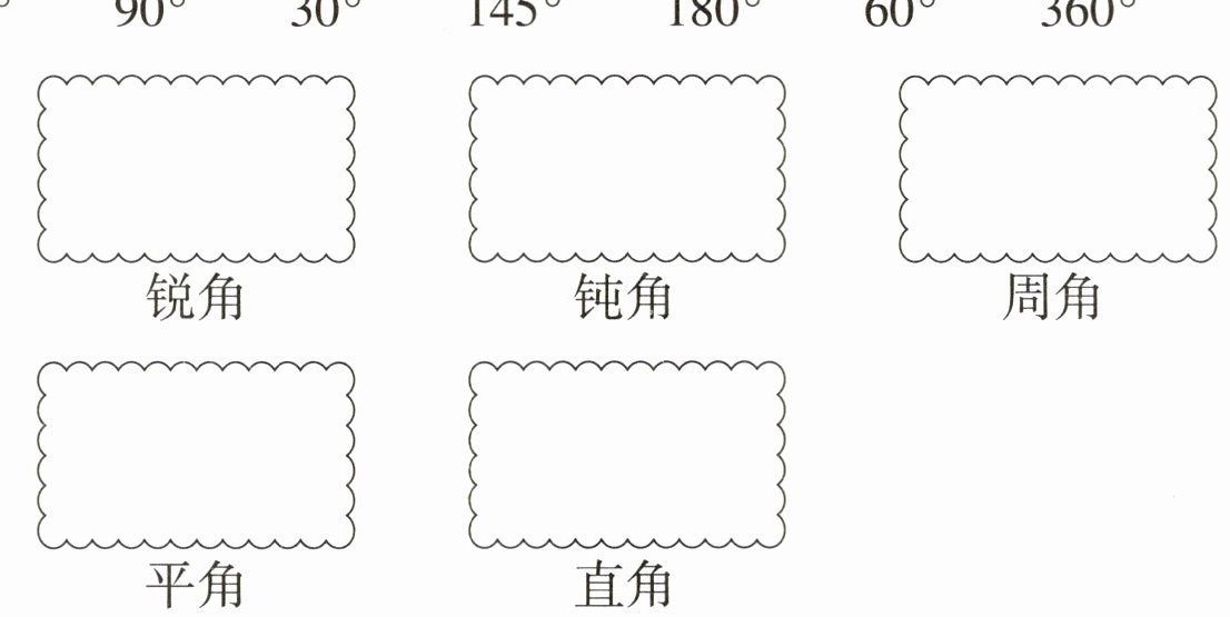 4. 把锐角、平角、钝角、周角、直角按要求排一排: (
