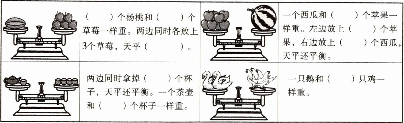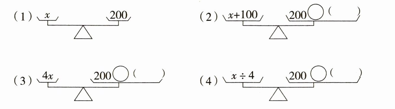 六、根据图(1)在下面每幅图的圆圈和括号里填上适当的符号和数字,使天平平衡。
