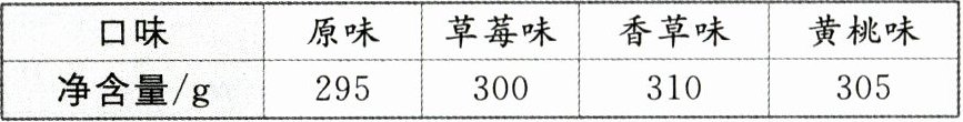 3. 某酸奶外包装上标明“净含量:$(300\pm 5)g$”,随机抽取四种口味的酸奶分别称重,数据如下表.其中,净含量不合格的酸奶口味是(