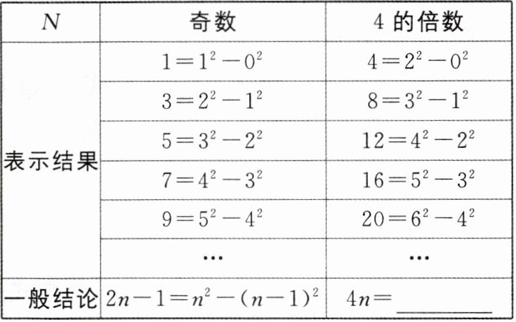 17. [2024·安徽中考节选]数学兴趣小组开展探究活动,研究了“正整数 $N$ 能否表示为 $x^{2}-y^{2}$($x$,$y$ 均为自然数)”的问题。指导教师将学生的发现进行整理,部分信息如下($n$ 为正整数):