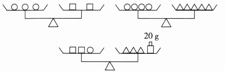 14. 推理能力 已知○、△、□分别代表不同的物体,用天平比较它们的质量,如图所示. 根据砝码显示的质量,可得○=