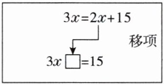 3. [知识初练]如图,将方程$3x = 2x + 15$移项,令含有未知数的项移到等号的