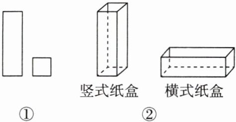 9. (8分)[2025年1月合肥期末]某工厂生产如图①所示的长方形和正方形纸板,做成如图②所示的竖式与横式两种长方体形状的无盖纸盒,其中竖式纸盒由4个长方形和1个正方形纸板做成,横式纸盒由3个长方形和2个正方形纸板做成(给定的长方形和正方形纸板都不用裁剪,也不考虑接缝).