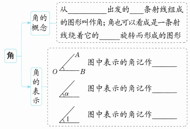 同一点;两;端点;∠AOB或∠O;∠α;∠1