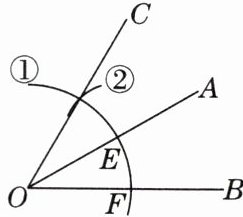 2. 如图,用尺规作图作$∠AOC = ∠AOB的第一步是以点O$为圆心,任意长为半径画弧①,分别交$OA$,$OB于点E$,$F$,那么第二步的作图痕迹②的作法是(