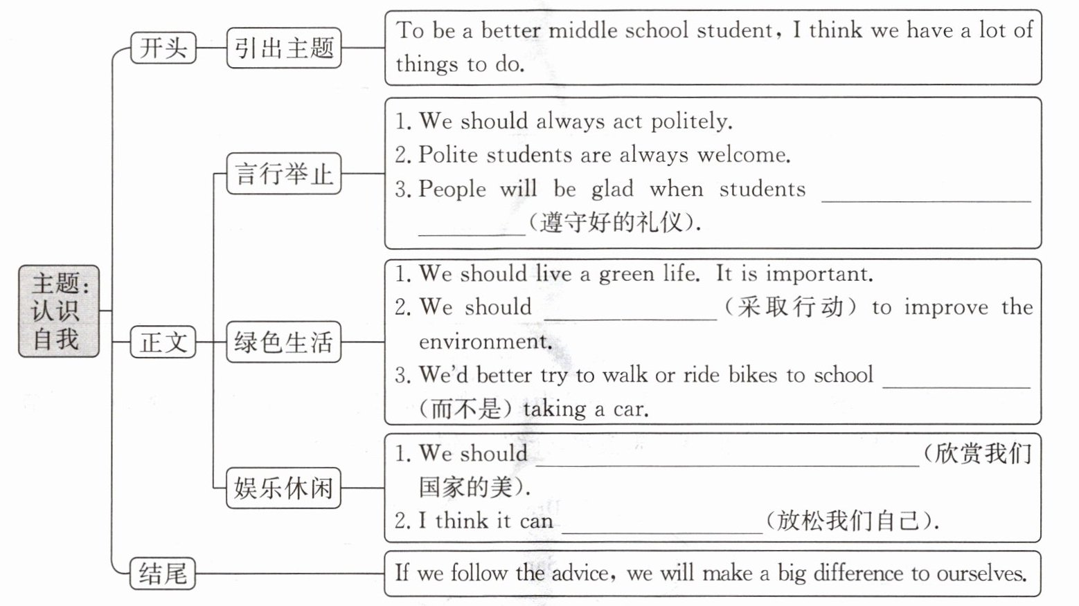 参考词汇:politely(adv. 礼貌地),manners(n. 礼仪),environment(n. 环境),take action(采取行动)