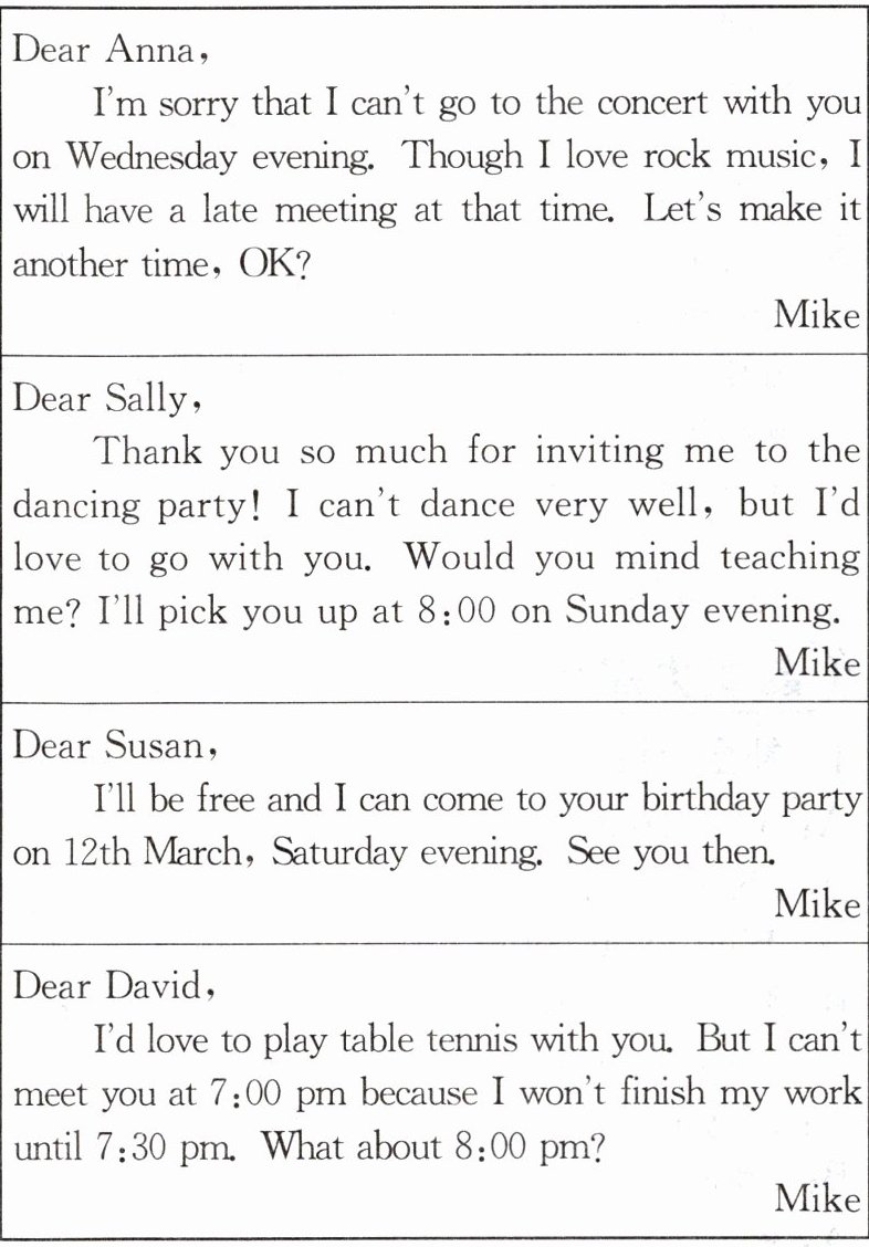 Mike has many friends and he is a very popular young man. This month he got four invitations. Here are his replies.
