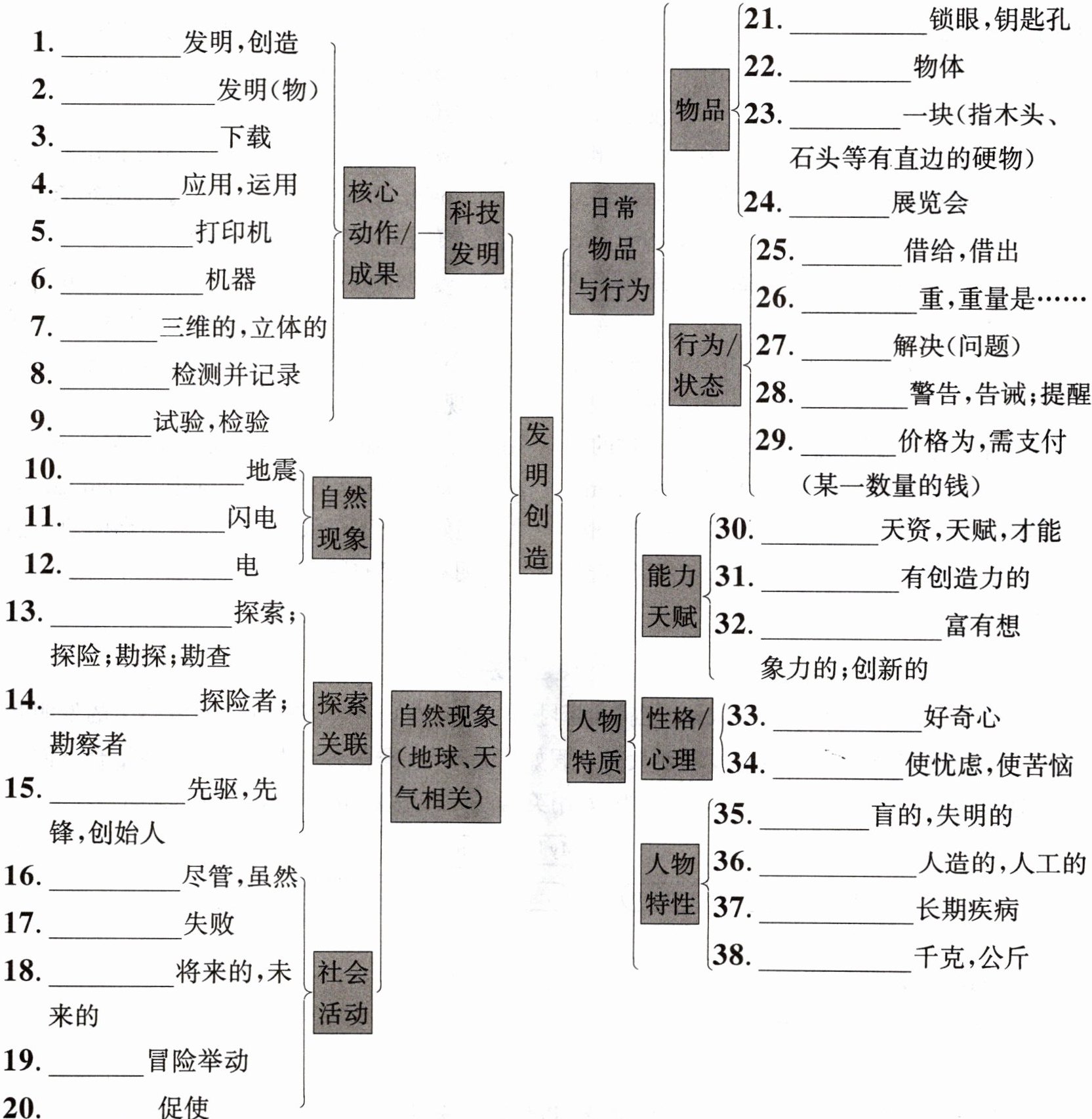 1.invent 2.invention 3.download 4.apply 5.printer 6.machine 7.3-D 8.sense 9.test 10.earthquake 11.lightning 12.electricity 13.exploration 14.explorer 15.pioneer 16.despite 17.failure 18.future 19.risk 20.drive 21.keyhole 22.object 23.block 24.fair 25.lend 26.weigh 27.fix 28.warn 29.cost 30.talent 31.creative 32.imaginative 33.curiosity 34.trouble 35.blind 36.artificial 37.condition 38.kilogram