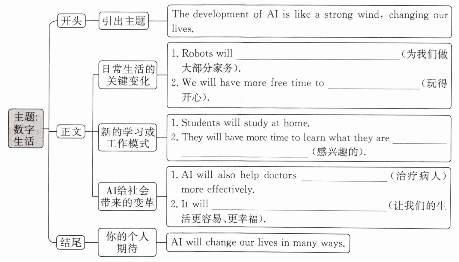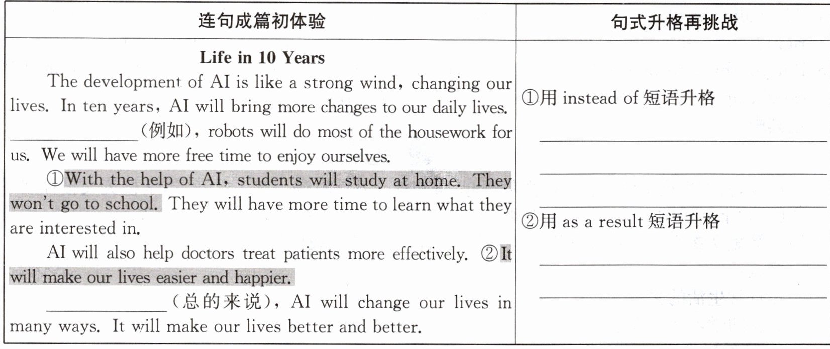Step 1 2.一、三 3.一般将来时 Step 2 正文 日常生活的关键变化:1.do most of the housework for us 2.enjoy ourselves 新的学习或工作模式:2.interested in AI给社会带来的变革:1.treat patients 2.make our lives easier and happier Step 3 连句成篇初体验 For example In a word 句式升格再挑战 ①With the help of AI, students will study at home instead of going to school. ②As a result, it will make our lives easier and happier. Step 4 ...In ten years, AI will bring more changes to our daily lives. For example, robots will do most of the housework for us. We will have more free time to enjoy ourselves. With the help of AI, students will study at home instead of going to school. They will have more time to learn what they are interested in. AI will also help doctors treat patients more effectively. As a result, it will make our lives easier and happier. In a word, AI will change our lives in many ways. It will make our lives better and better.