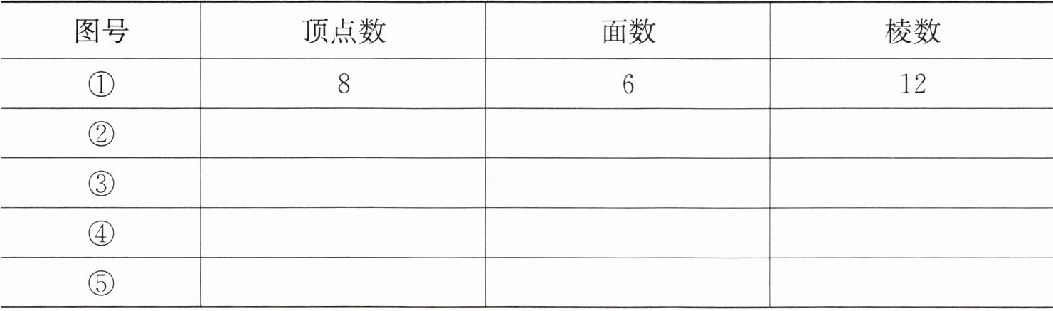 我们知道图①中的正方体木块有 8 个顶点、12 条棱、6 个面.请你将图②③④⑤中木块的顶点数、棱数、面数填入下表:
