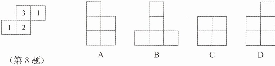 8. 如图是由几个小正方体搭成的立体图形的俯视图,小正方形中的数字表示在该位置小正方体的个数,则这个立体图形的左视图为 【 】