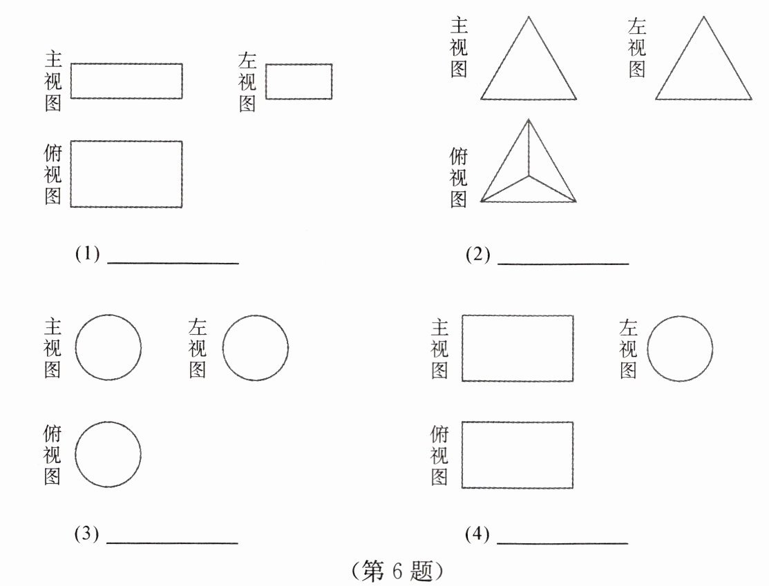 6. 如图(1)~(4)是一些立体图形的三视图,请在横线上填上相应立体图形的名称.