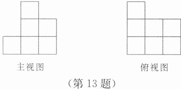 13. 用大小相同的小正方体搭成一个立体图形,使得它的主视图和俯视图如图所示,这样的立体图形只有一种吗?它最少需要多少个小正方体?最多需要多少个小正方体?请在俯视图上标出最多情况时相应位置的小正方体的个数.