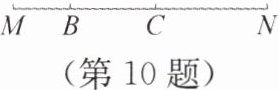 10. 如图,B、C两点把线段MN分成三部分,其比为$ MB:BC:CN = 2:3:4 $,P是MN的中点,$ PC = 2\mathrm{cm} $,求MN的长。