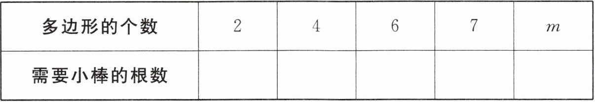 (1)摆2个这样的多边形需要用多少根小棒?摆4个、6个、7个、m个呢?(填在下表中。)