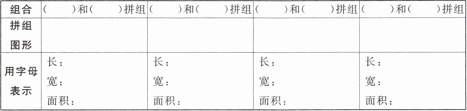 从下面的四个图形中任选两个图形,拼组成长方形,并完成下表。