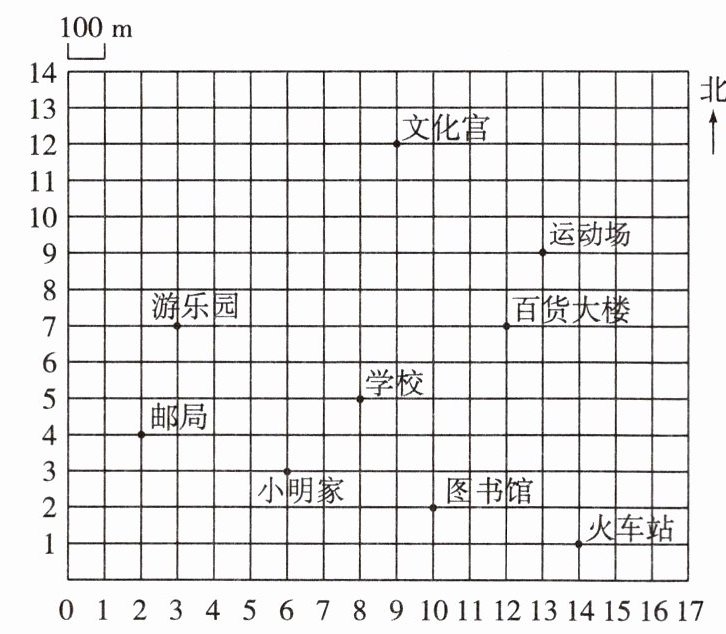 (1)游乐园(3,7) 小明家(6,3) 学校(8,5) 文化宫(9,12) 图书馆(10,2) 百货大楼(12,7) 运动场(13,9) 火车站(14,1)