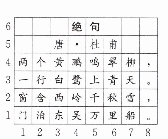 右边的方格纸中写的是杜甫的《绝句》,“绝”字的位置用数对(4,6)表示。