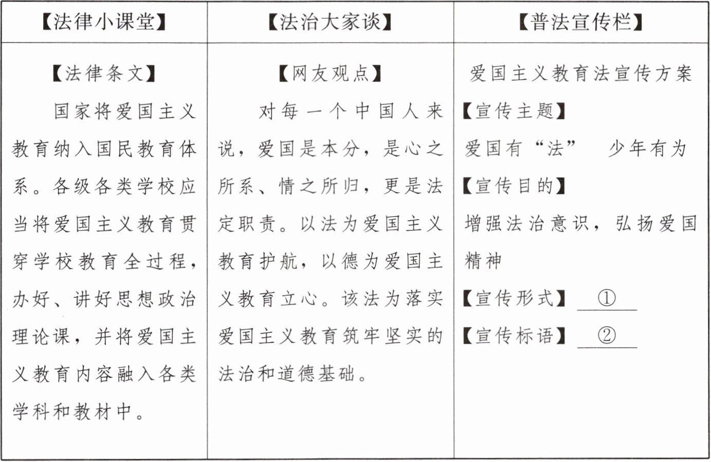 | 【法律条文】国家将爱国主义教育纳入国民教育体系。各级各类学校应当将爱国主义教育贯穿学校教育全过程,办好、讲好思想政治理论课,并将爱国主义教育内容融入各类学科和教材中。 | 【网友观点】对每一个中国人来说,爱国是本分,是心之所系、情之所归,更是法定职责。以法为爱国主义教育护航,以德为爱国主义教育立心。该法为落实爱国主义教育筑牢坚实的法治和道德基础。 | 爱国主义教育法宣传方案【宣传主题】爱国有“法” 少年有为【宣传目的】增强法治意识,弘扬爱国精神【宣传形式】 ①【宣传标语】 ② |