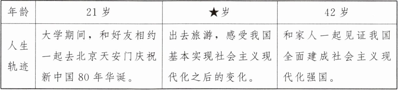 |人生轨迹|大学期间,和好友相约一起去北京天安门庆祝新中国 80 年华诞。|出去旅游,感受我国基本实现社会主义现代化之后的变化。|和家人一起见证我国全面建成社会主义现代化强国。|
