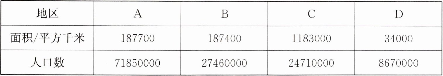 故答案依次为:(1)$1183000$;$187700$;$187400$;$34000$;(2)$8670000$;$24710000$;$27460000$;$71850000$;(3)不同地区面积和人口数差异较大(答案合理即可)。