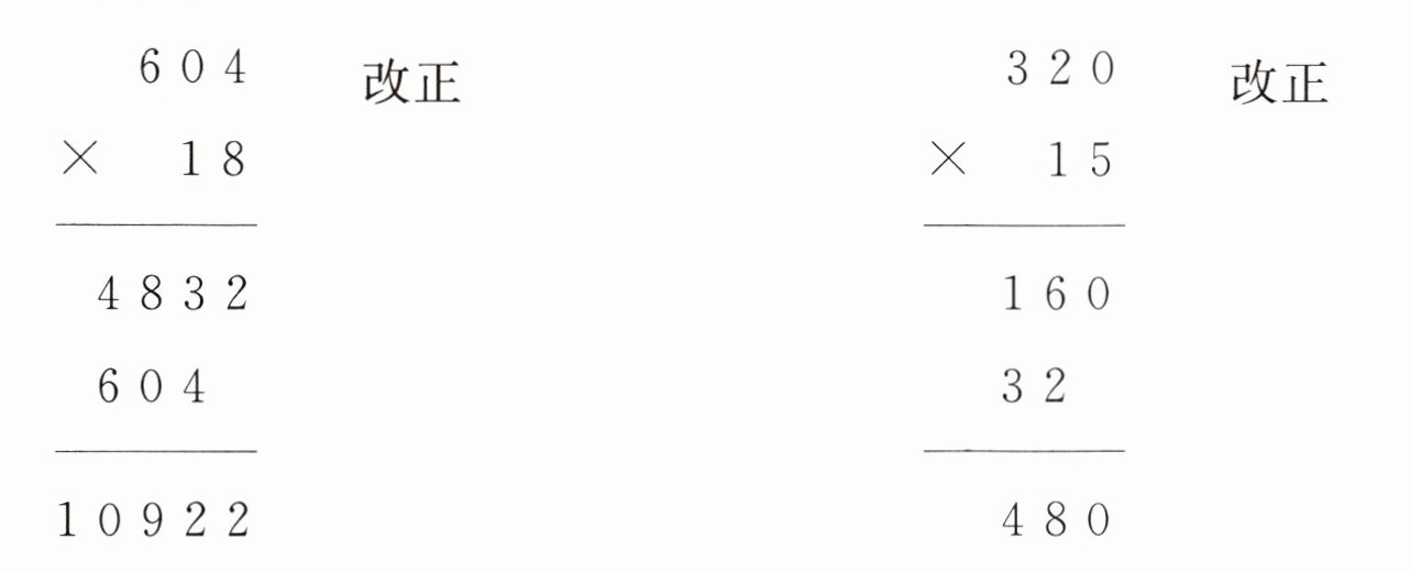 $\begin{array}{r} 604 \\ × 18 \\ \hline 4832 \\ 604 \\ \hline 10922 \end{array} $$ 改正 $\begin{array}{r} 320 \\ × 15 \\ \hline 160 \\ 32 \\ \hline 480 \end{array} $$ 改正
