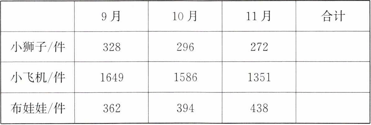 4. 下面是一家玩具厂去年 9~11 月生产玩具数量的统计表,请你把它补充完整。