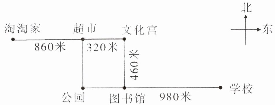 (2) 淘淘从家出发向____走____米到超市,再向____走____米到文化宫,最后向____走____米到图书馆。