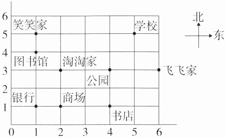 (5)仔细观察笑笑家、图书馆和银行的位置,你发现了什么? 淘淘家、公园和飞飞家呢?